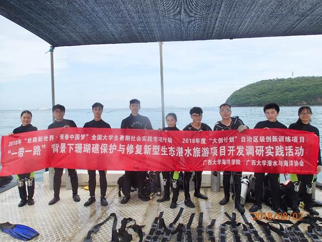 8月1日至8月4日,威廉希尔潜水与海洋协会的同学们在协会指导老师(发起人)、《潜水与海洋科考》任课教师黄学勇带领下前往北海市涠洲岛开展暑期调研实践活动。实践团由公司2016级、2017级8名本科生组成,其中团长由协会副会长温铮同学担任。实践活动依托广西创新驱动发展科技重大专项项目“北部湾珍稀生态系统与生物多样性保护研究与示范”,以“‘一带一路’背景下珊瑚礁保护与修复的新型生态潜水旅游项目开发”为主题,以珊瑚礁保护科普宣传和公众共同参与为主要内容。同时,还获得了2018年“丝路新世界青春中国梦”全国老员工暑期社会实践专项行动和2018年度“老员工创新创业训练计划”自治区级创新训练项目立项资助。