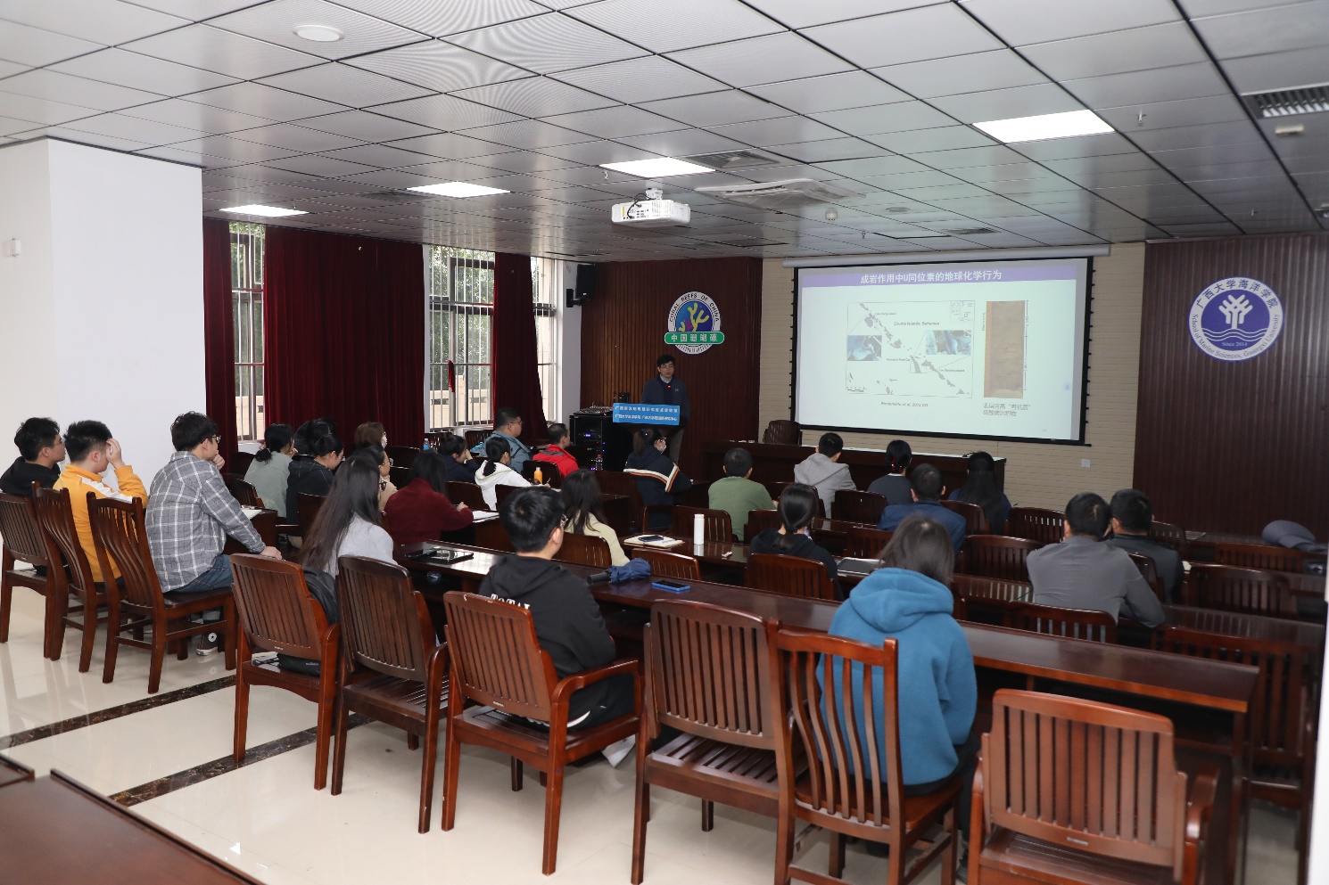 我国南海独特的珊瑚礁沉积物和千米深钻为理解沉积和成岩作用过程中金属稳定同位素行为提供了得天独厚的条件,海相碳酸盐岩作为广泛分布的化学沉积岩,是开展金属稳定同位素研究的重要载体。报告以Li、Ba、U同位素体系为例,介绍碳酸盐岩不同沉积和成岩过程对上述金属稳定同位素体系的影响及古环境示踪意义,报告内容丰富。讨论环节,张飞飞教授与师生们对金属稳定同位素是否能应用于珊瑚化石、在南海深钻的研究中金属稳定同位素与矿物相之间的关系等问题展开深入交流。
