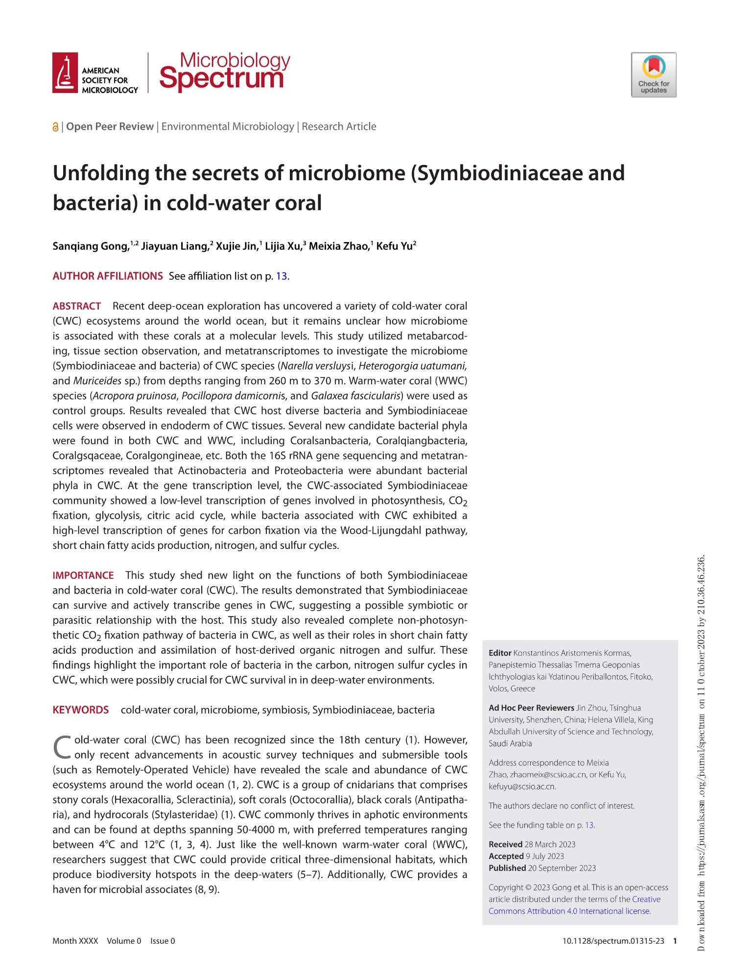 近日,广西南海珊瑚礁研究重点实验室客座研究员巩三强(威廉williamhill体育南海海洋研究所博士)为首在威廉williamhill体育一区Top期刊Microbiology Spectrum发表了题为 “Unfolding the secrets of microbiome (Symbiodiniaceae and bacteria) in cold-water coral”的研究论文。该研究结合细菌16S及藻类ITS2 barcodes高通量扩增测序、宏转录组测序及组织切片观察等技术, 首次在冷水珊瑚中确证了具有细胞活性的虫黄藻类群(Cladocopium 和Durusdinium)的存在,并在基因转录水平重构了完整的冷水珊瑚中虫黄藻的关键代谢途径, 包括光合碳固定等。 该研究初步界定了几个丰度较高的细菌新类群, 其中包括2个潜在的细菌新门:命名为珊瑚三(Coralsanbacteria)和珊瑚强(Coralqiangbacteria)细菌门,其中Coralsanbacteria可能是光合细菌蓝藻的祖先类群,并在基因转录水平重构了完整的冷水珊瑚中细菌的关键代谢途径,包括古老的非光合CO2 固定通路(the Wood-Lijungdahl pathway),硫循环通路(inorganic sulfur assimilation and organic sulfur disassimilation pathways),短链脂肪酸合成通路(short chain fatty acids synthesis pathways for acetate, butyrate, and propionate)等。