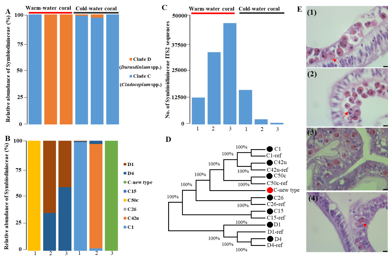 该研究拓展了人们对共生虫黄藻分布范围的认识,发现虫黄藻可以生存于370m水深的冷水珊瑚中。该研究提示细菌可能在冷水珊瑚适应弱光低温的深水生境中扮演重要角色,包括通过非光合碳固定途径为宿主提供有机碳来源等。该研究为进一步深入解析深水生境中珊瑚共生体共生机制及其环境适应机理奠定了基础。