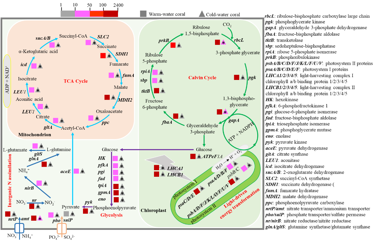 图4. 不同类型珊瑚中虫黄藻关键代谢途径