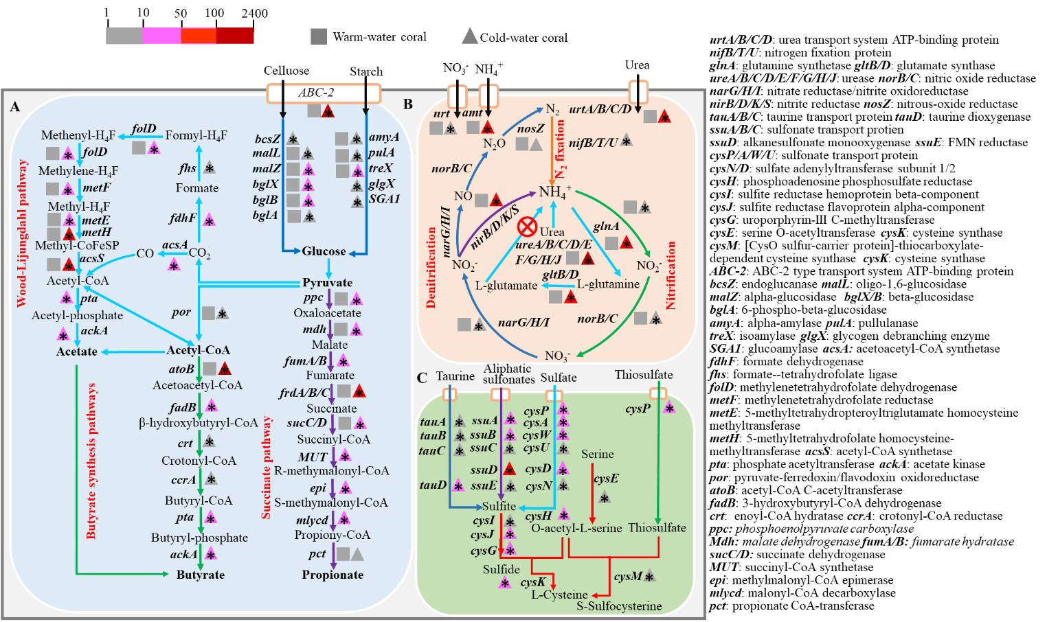 图5. 不同类型珊瑚中细菌关键代谢途径