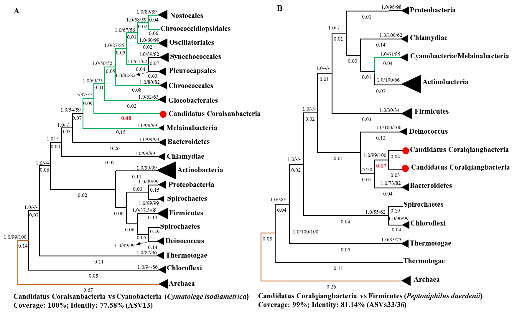 图3. 不同类型珊瑚中检测到的丰度较高的2个潜在的细菌新门