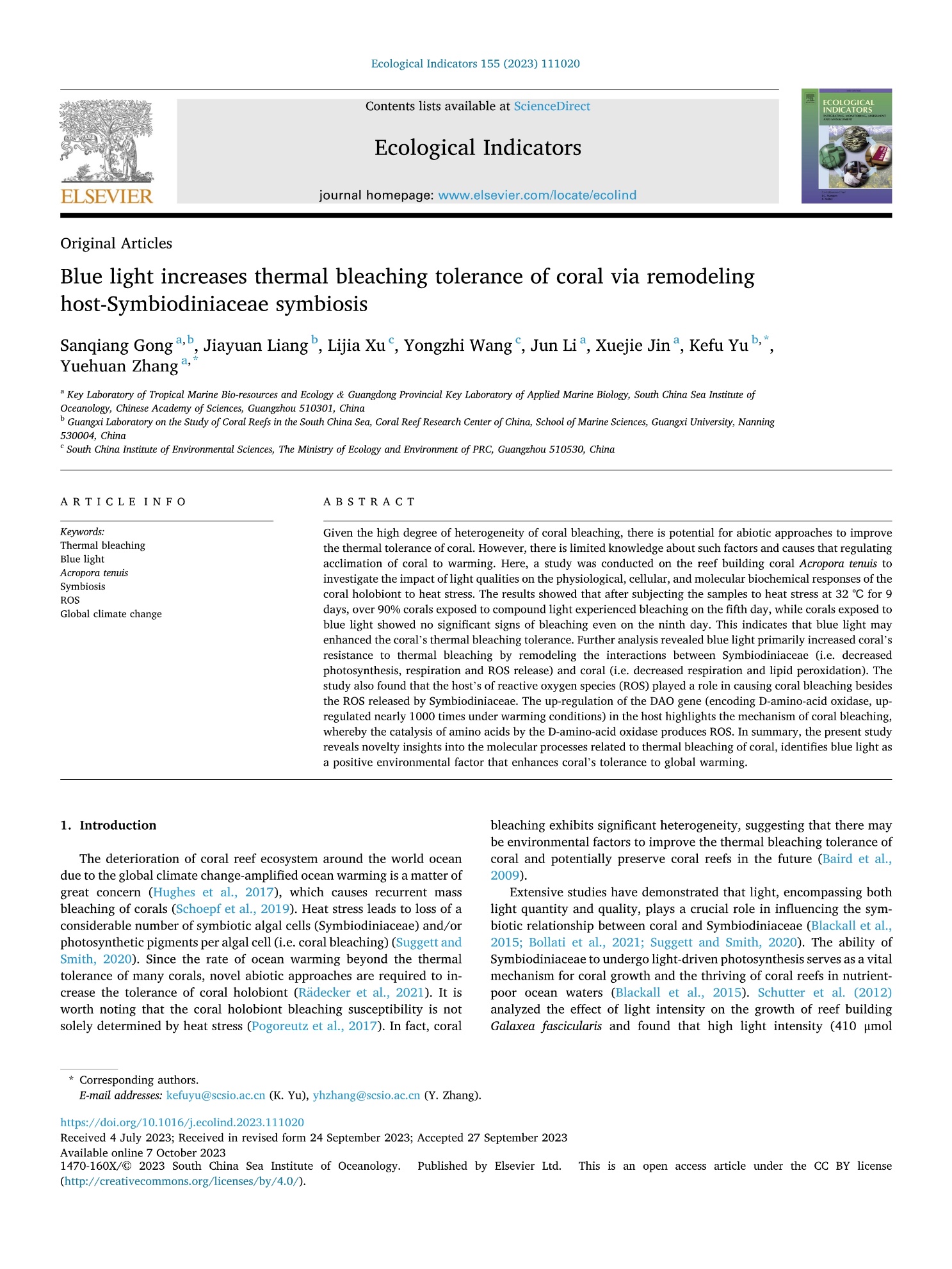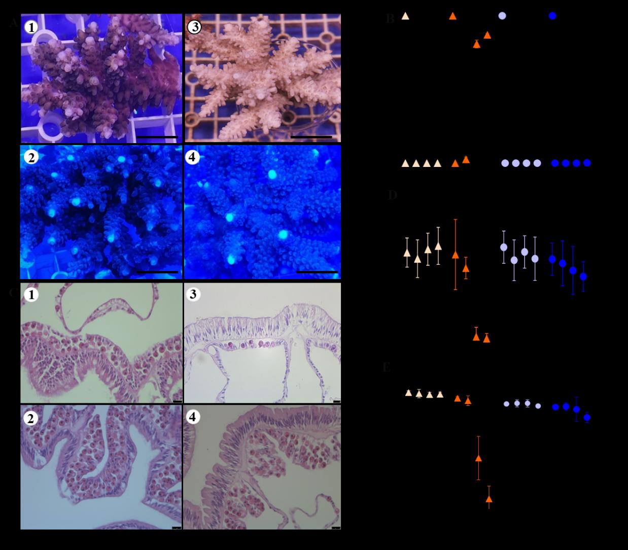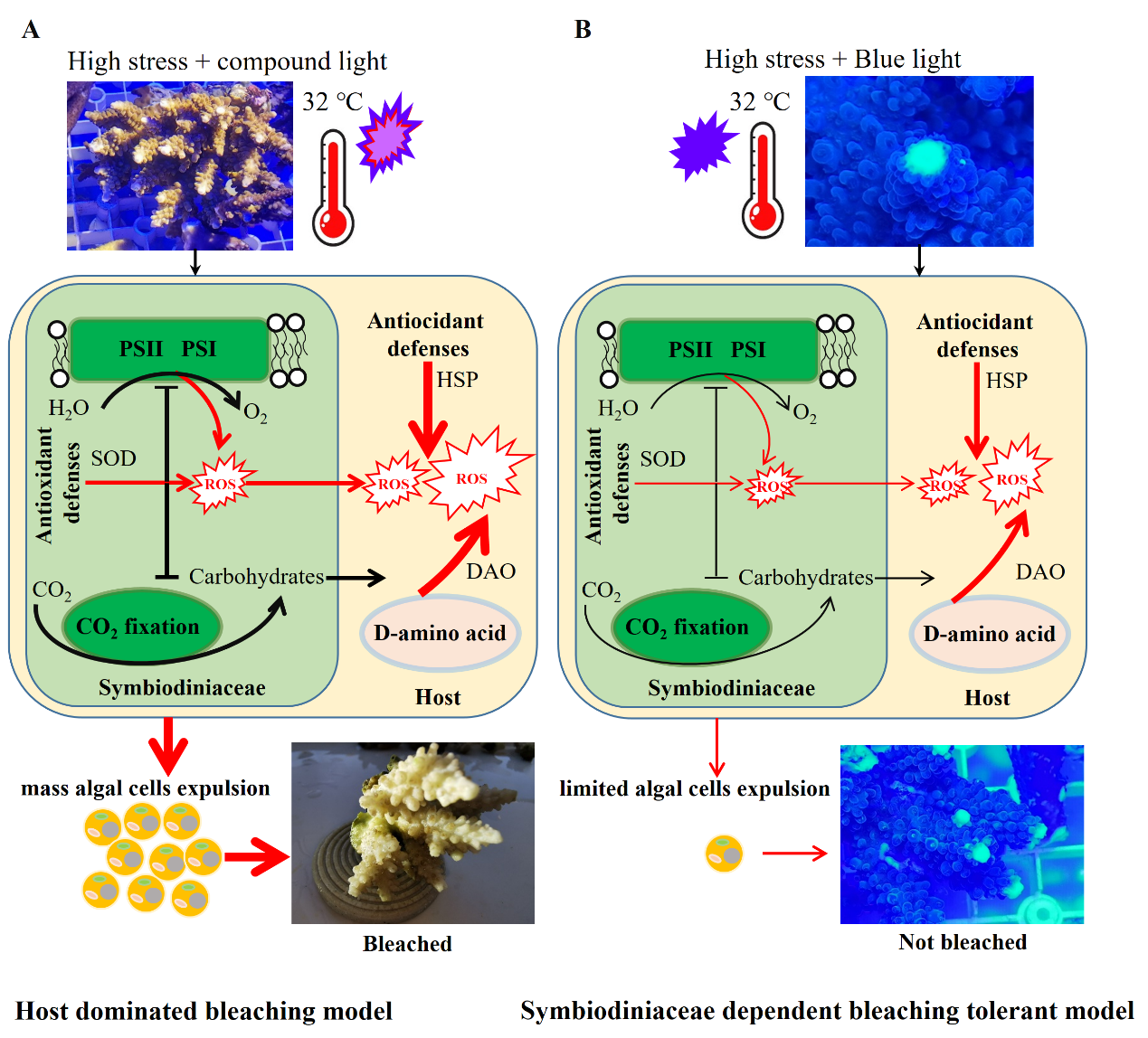 近日,广西南海珊瑚礁研究重点实验室客座研究员巩三强(威廉williamhill体育南海海洋研究所博士)为首在威廉williamhill体育二区Top期刊Ecological Indicators发表了题为“Blue light increases thermal bleaching tolerance of coral via remodeling host-Symbiodiniaceae symbiosis”的研究论文。该研究结合珊瑚组织学、珊瑚代谢特征分析及宏转录组测序等技术,首次分析了蓝光在珊瑚热白化中的潜在作用。研究发现蓝光能够通过重塑珊瑚 - 虫黄藻之间的共生互作关系增强珊瑚共生体的热白化耐受性,这一发现为全球气候变化背景下通过光调控开展珊瑚保育工作及拯救珊瑚礁生态系统提供了新思路。传统观点普遍认为升温胁迫下共生虫黄藻光合抑制产生的活性氧(ROS)是导致珊瑚排藻白化的主要途径或原因,但本研究同时发现热胁迫条件下宿主ROS的释放量与珊瑚白化有关,并从分子水平检测到宿主D型氨基酸氧化过程可能是升温胁迫下宿主ROS的释放途径之一。(广西南海珊瑚礁研究重点实验室/文 论文/图 巩三强、周剑/编辑 余克服/审核)