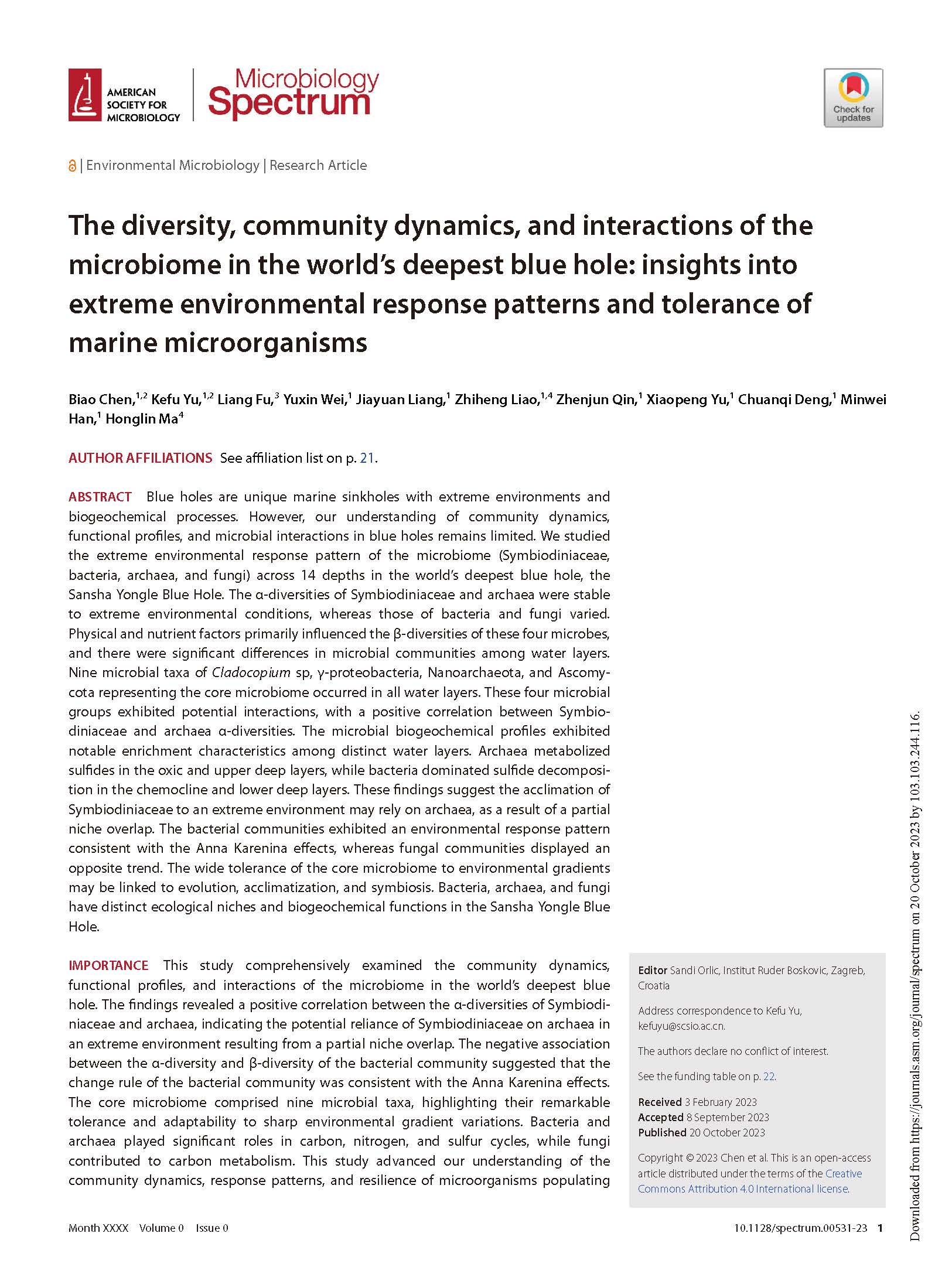Chen Biao, Yu Kefu, Fu Liang, Wei Yuxin, Liang Jiayuan, Liao Zhiheng, Qin Zhenjun, Yu Xiaopeng, Deng Chuanqi, Han Mingwei, and Ma Honglin. (2023). The diversity, community dynamics, and interactions of the microbiome in the world’s deepest blue hole: insights into extreme environmental response patterns and tolerance of marine microorganisms. Microbiology Spectrum. doi: 10.1128/spectrum.00531-23.