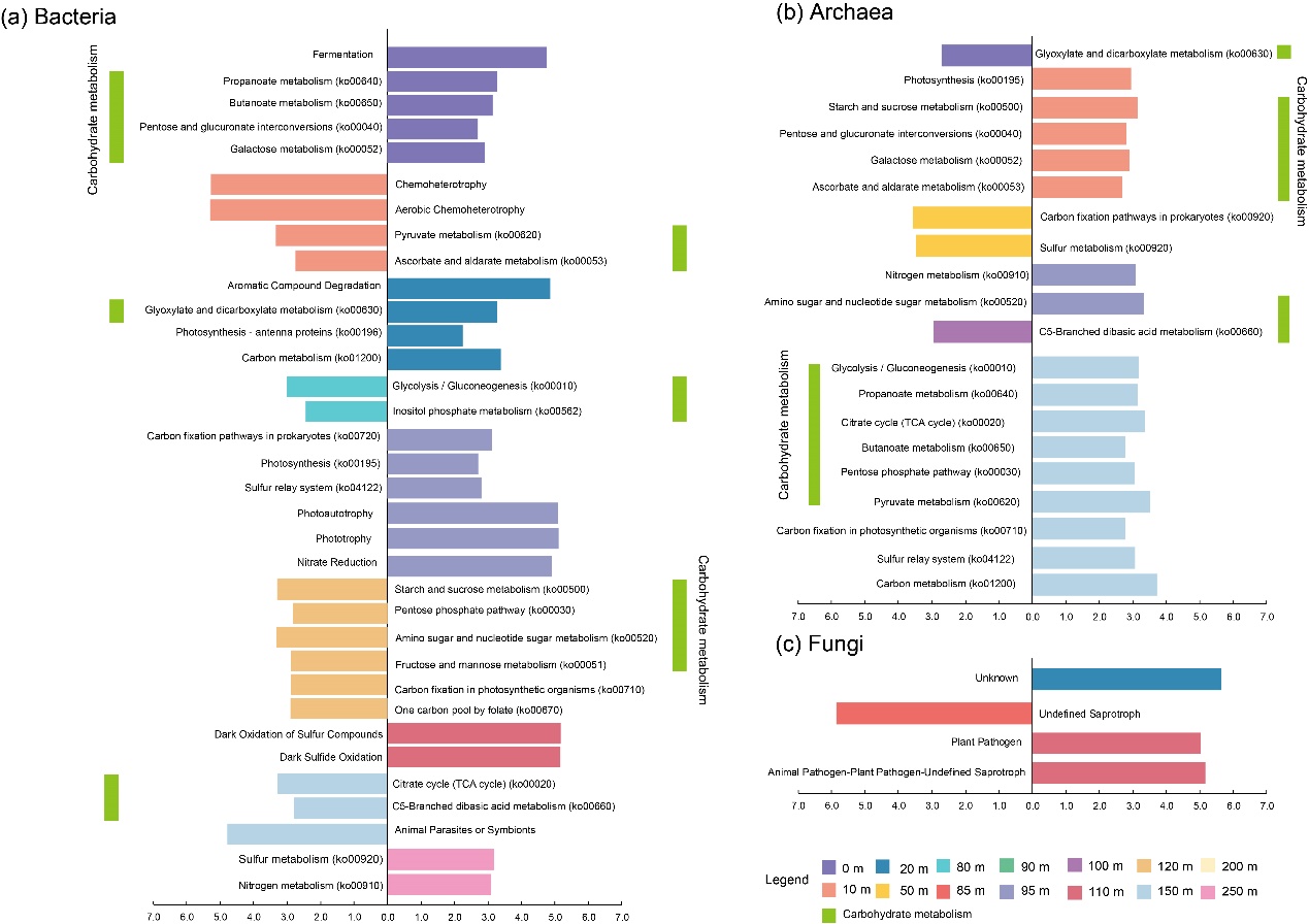 (4)三沙永乐龙洞水体中的微生物存在活跃的交互作用,但其交互作用网络则主要由真菌驱动。龙洞水体微生物互作网络的复杂度在富氧层表面(0m)、化变层底部(110m)以及深水厌氧层底部达到峰值(250m)。该结果指示了三沙永乐龙洞不同水层交界面环境因子的突变与耦合作用是水体微生物互作与生命活动的主要驱动因素。