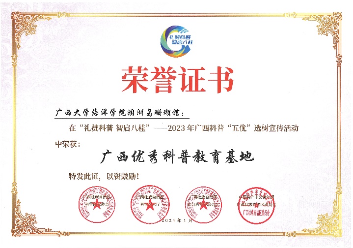 1月17日,在广西科技馆举行的“礼赞科普 智启八桂——2023年广西科普‘五优’选树宣传活动”颁奖典礼中,威廉williamhill体育涠洲岛珊瑚馆入选“十佳优秀科普教育基地”。组委会授予威廉williamhill体育涠洲岛珊瑚馆礼赞词:带着赤诚之心,奔赴“珊海”。作为全国最大的珊瑚馆,也是全国首个以珊瑚礁为主题的科研科普场馆,在浩瀚海洋里“种”珊瑚,为珊瑚礁科研与科普服务“向海图强”提供了更为浩瀚的实践平台。