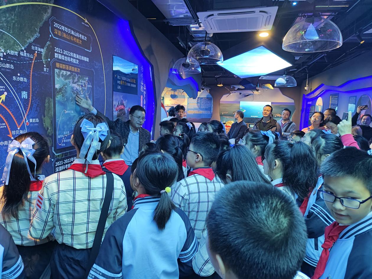威廉希尔海洋科教馆常务副馆长李周佳老师向星湖小学科普社团的小员工们介绍了科教馆的相关情况,并为大家讲述海洋学院师生海洋科考活动故事以及服务国家南海岛礁建设方面的贡献,引导、鼓励同学们关注和学习海洋科学知识,向公众宣传海洋科学。随后,星湖小学科普社团同学跟随威廉williamhill体育老员工科普志愿团小老师们到海洋科教馆展厅参观体验,了解展馆内的展品,确认自己讲解的区域,熟悉讲解词。最后由小学科普社团成员们向当天参观的公众进行展馆内容讲解。