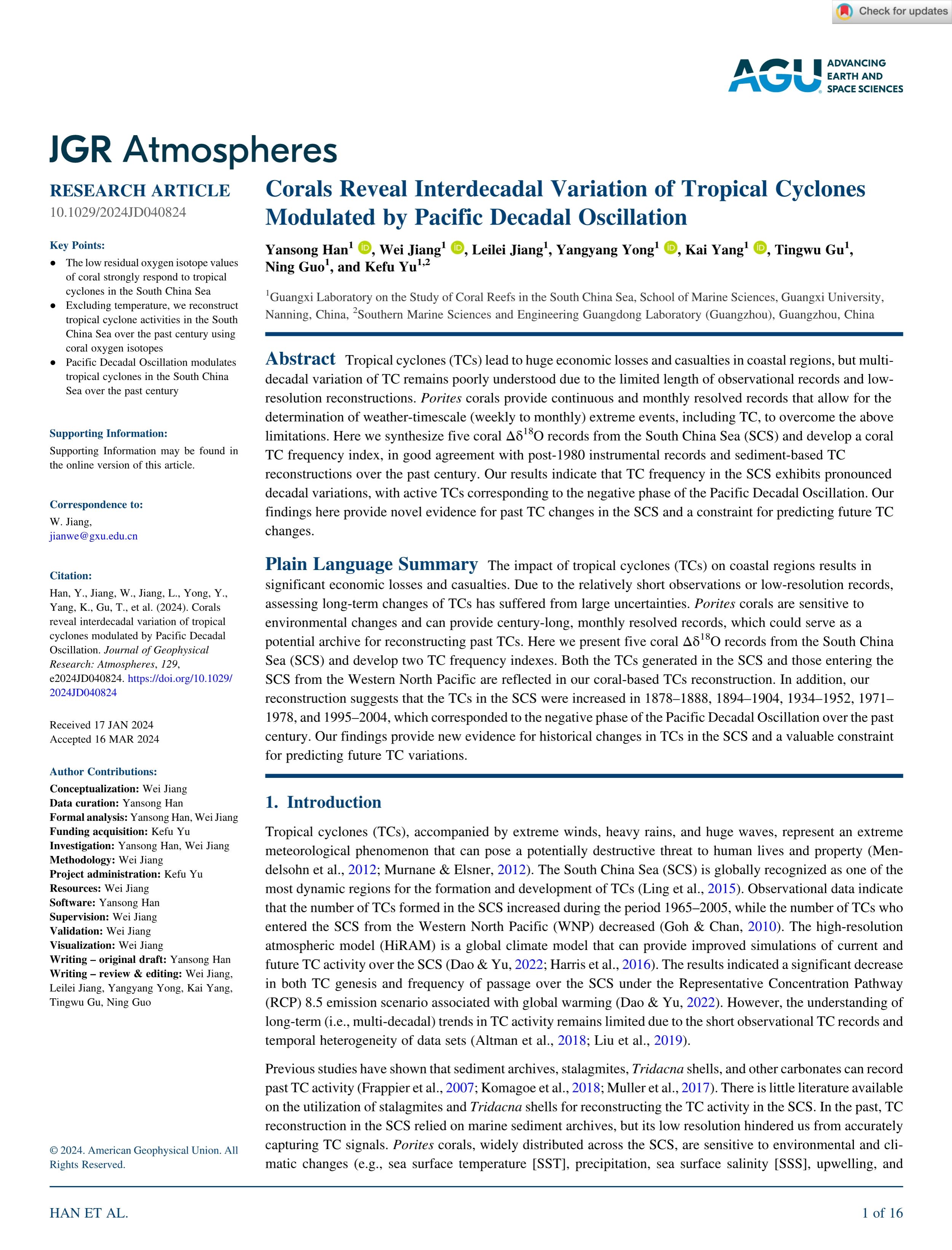 Han, Y., Jiang, W., Jiang, L., Yong, Y., Yang, K., Gu, T., Guo, N., Yu, K., et al. (2024). Corals Reveal Interdecadal Variation of Tropical Cyclones Modulated by Pacific Decadal Oscillation. Journal of Geophysical Research: Atmospheres, 129(7), e2024JD040824. https://doi.org/10.1029/2024JD040824