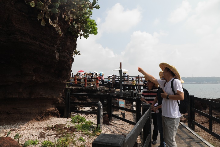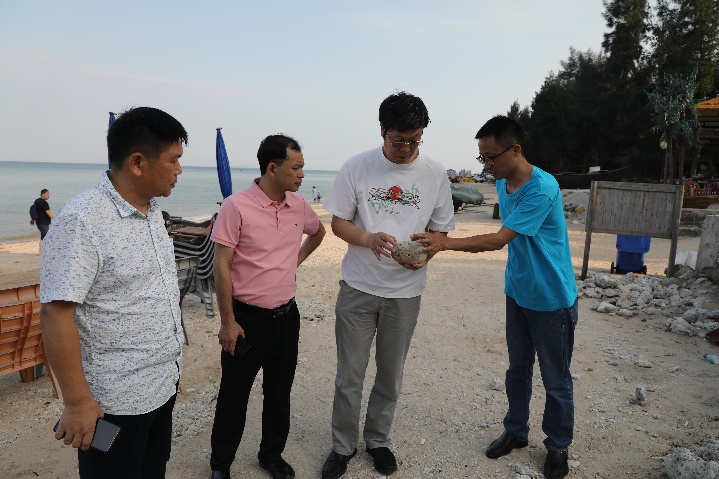 考察涠洲岛珊瑚礁海滩沉积和以珊瑚礁沉积物为主形成的海滩岩地貌景观