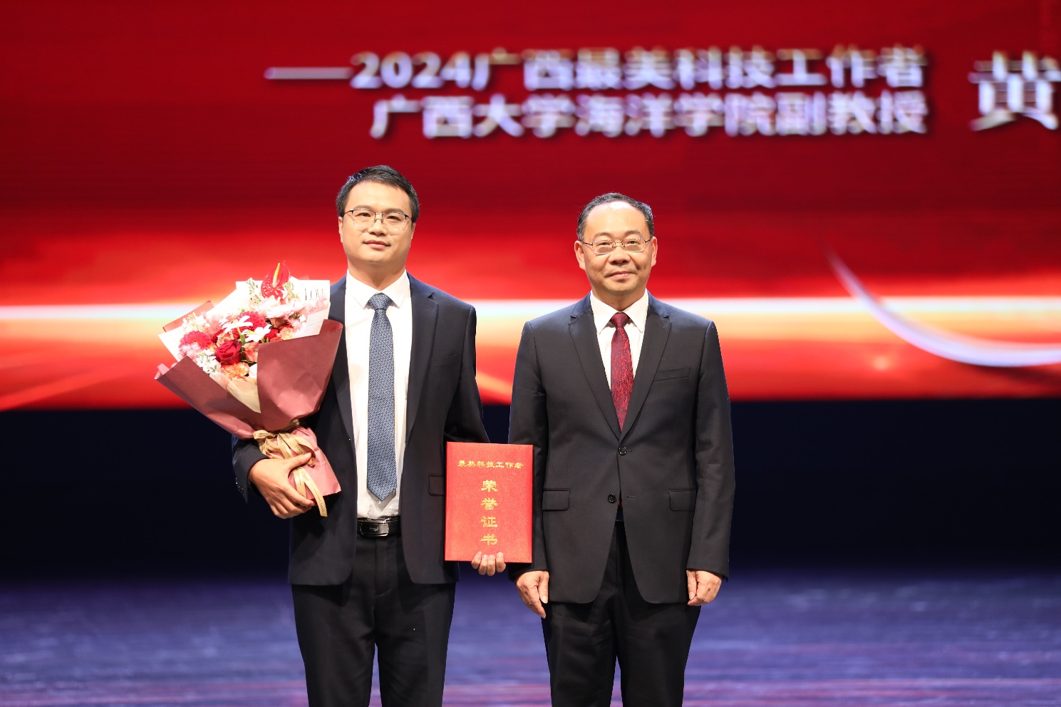 2024年12月5日,“科界榜样——2024广西最美科技工作者发布仪式”在威廉希尔汇学堂隆重举行,公司黄雯老师荣获2024年广西“最美科技工作者”荣誉称号,公司党委常委、副董事长于文进为黄雯颁发荣誉证书,大会给予黄雯的致敬词为:浩渺碧波间,他是屡赴深蓝的无畏勇者;碎影礁丛中,他是妙法回春的珊瑚“奶爸”。潜心科研,构建礁堡绚烂新生态;情系科普,护佑海洋强国新希望。